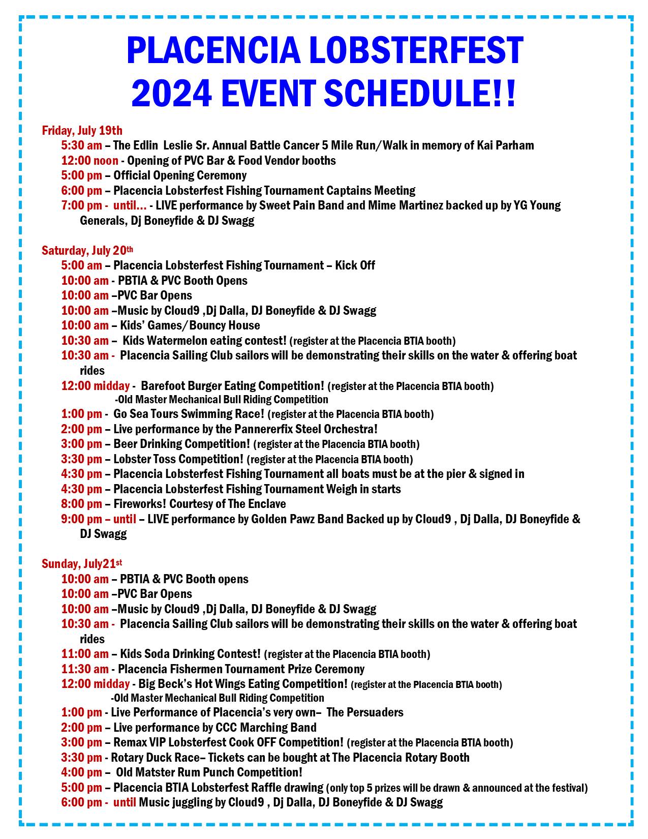 Sunday is all about family fun, with activities like the kids’ soda drinking contest and boat rides with the Placencia Sailing Club. Live music performances from the Pannerifix Steel Orchestra, The Persuaders, and the CCC Marching Band will entertain the crowds. The day also features the Remax VIP Lobsterfest Cook-Off Competition and the Rotary Duck Race.